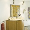 Waschtischschrank aus Erleholz gefertigt. Gerundete Türenfront und auch gerundeter Wandanschluß. Waschbecken aus Keramik im Materialverbund mit Marmorfläche.