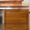 Empfangscounter in Palisanderholz furniert. Furnierbild waagerecht umlaufend incl. der Korpuskanten. Inntere Arbeitsfläche im Schreibbereich mit Linoleum ausgelegt. Stirnseitig zwei Aktenauszüge eingearbeitet.