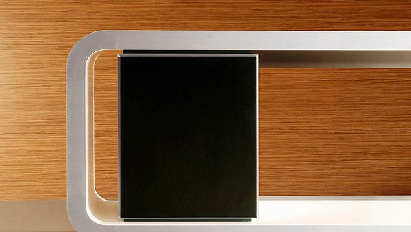 Detailansichten der Messestände von Samsung. Viertelgerundete Korpuselemente in Segmenten zusammengesetzt und weiss lackiert. Stirnkanten in Edelstahl be- legt. Korpuselemente mit schwarz lackierten Türen, welche mit Aluminiumschienen einfaßt sind. Grifflose „Push-to-open“-Technik zum Öffnen.